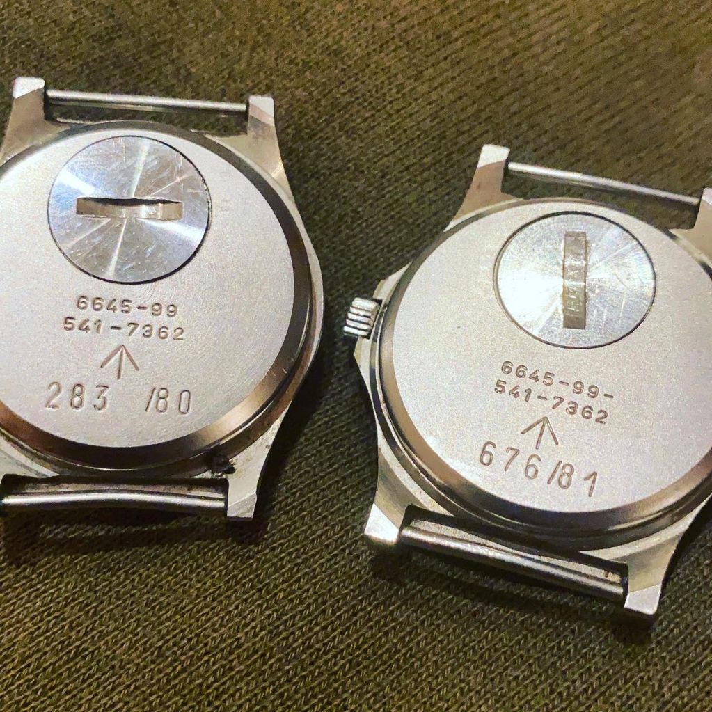 1981 - old logo slightly lower on dial than on lumed version; SWISS at bottom of the dial; no service code in front of NSN; no circled T on the dial, and dial and hands finished in white; known serial number range 1012 to 1092.